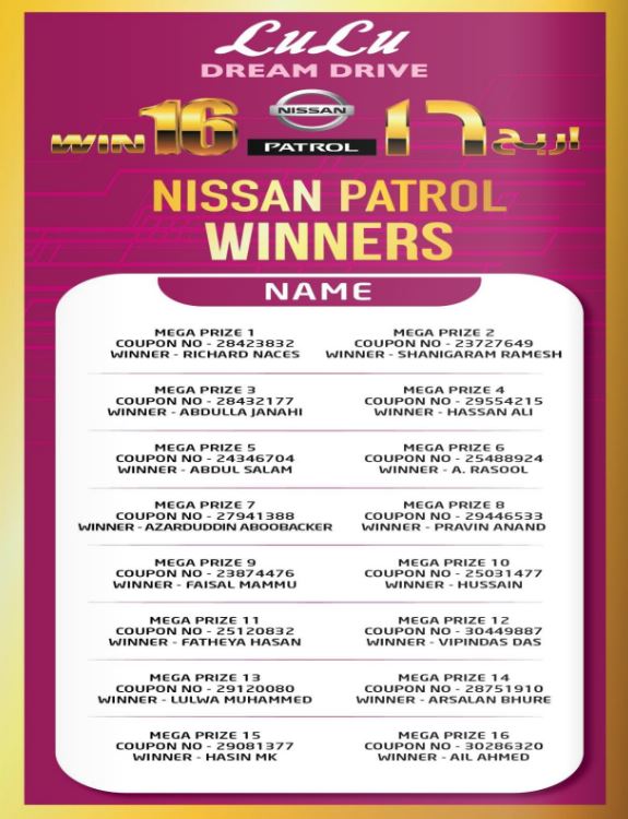 Sixteen LuLu Hypermarket customers won a Nissan Patrol top-of-the-line SUV car each in the kingdom’s most valuable car raffle draw, the LuLu Dream Drive.