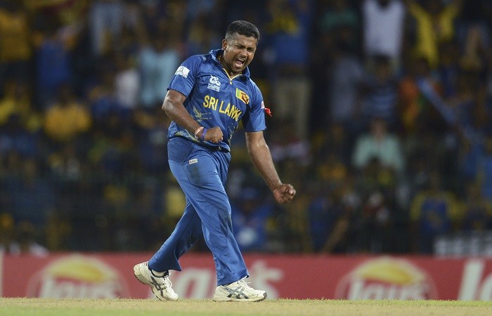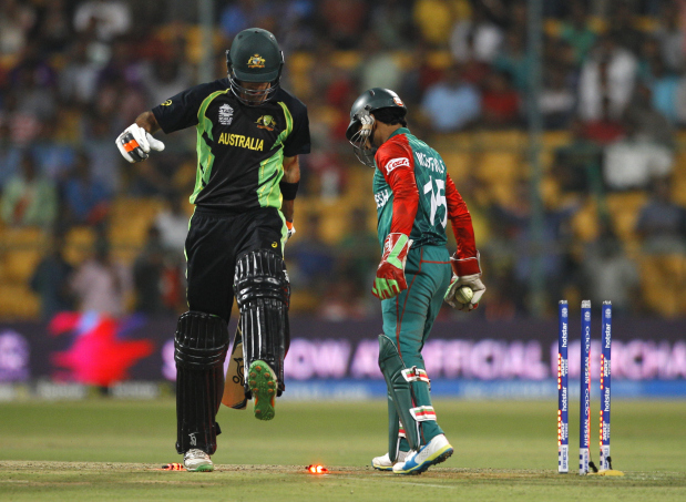 Australia's Glenn Maxwell, left, reacts after Bangladesh's wicketkeeper Mushfiqur Rahim, right, stumped him out during their ICC World Twenty20 2016 cricket match in Bangalore, India, Monday, March 21, 2016. (AP Photo)
