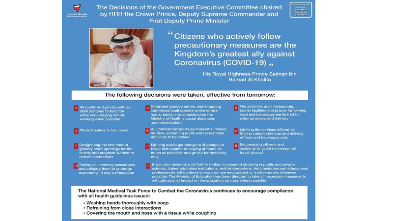 They will be enforced for a period of one month, subject to extension, under the directives of His Royal Highness Prince Salman bin Hamad Al Khalifa, Crown Prince, Deputy Supreme Commander and First Deputy Premier.