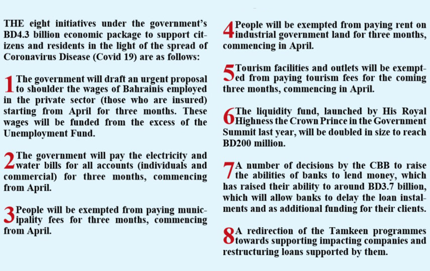 Details of the unprecedented economic package were announced last night at a Press briefing chaired by Finance and National Economy Minister Shaikh Salman bin Khalifa Al Khalifa, Industry, Commerce and Tourism Minister Zayed Alzayani, Central Bank of Bahrain (CBB) Governor Rasheed Al Maraj, Labour and Social Development Minister Jameel Humaidan, and Electricity and Water Affairs Minister Wael Al Mubarak.