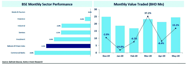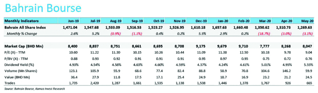 MANAMA: The Bahrain Bourse (BHB) continued its declining trend into May 2020, and receded by 3.1 per cent month-on-month (MoM).