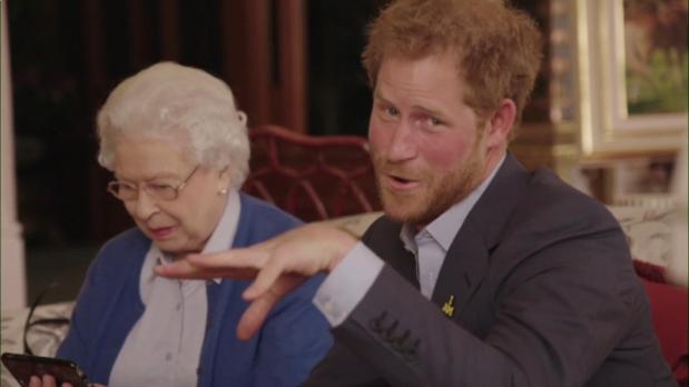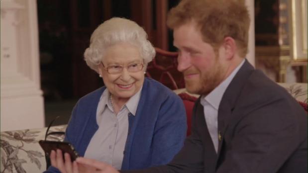 This image taken from a video released by Kensington Palace, London, on Friday April 29, 2016 shows Queen Elizabeth II sitting with her grandson, Prince Harry looking at an Invictus Games brochure. Prince Harry, released the video Friday promoting the upcoming Invictus Games for wounded veterans. (@KENSINGTONROYAL via AP)