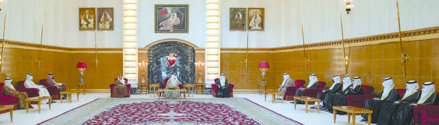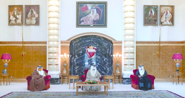 The King paid tributes to HRH Prince Khalifa as he received, in the presence of His Royal Highness Prince Salman bin Hamad Al Khalifa, Crown Prince Prime Minister, Deputy Premier Shaikh Ali bin Khalifa Al Khalifa, Shaikh Salman bin Khalifa Al Khalifa and Interior Ministry’s Under-Secretary for Nationality, Passports and Residence Affairs Shaikh Rashid bin Khalifa bin Hamad Al Khalifa at Sakhir Palace.
