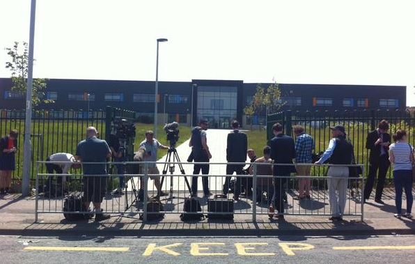 West Yorkshire Police have launched a manhunt for a 14-year-old Asian boy who stabbed a male teacher at Dixons Kings Academy (08:55 BST).