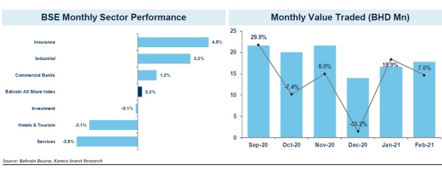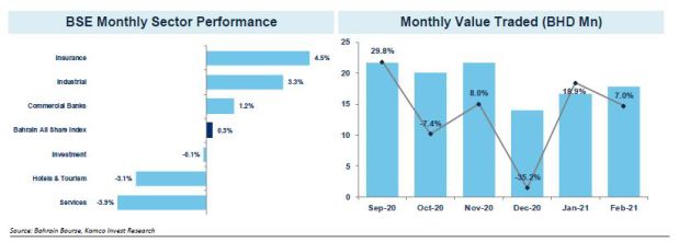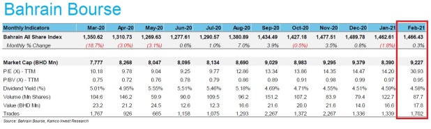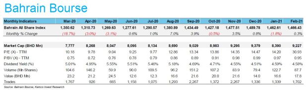 MANAMA: The Bahrain Bourse (BHB) reported marginal gains during February 2021 on the back of mixed performance in sectoral indices.