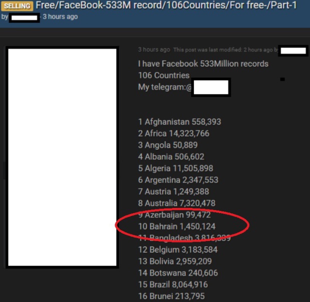 The personal information of around half a billion Facebook users from more than 100 countries, including Bahrain, has been made public, it has emerged.