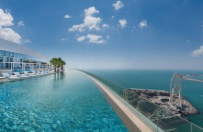 The iconic 77-storey twin towers, housing Address Beach Resort and Address Beach Residences, are linked with now record-breaking 210-metre high skybridge that hosts some of the finest residential and serviced apartments available for sale in Dubai. The highest outdoor infinity pool in a building in the world is located on the rooftop of the resort and offers incomparable views of the Arabian Gulf, Palm Jumeirah and Bluewaters Island. - TradeArabia News Service