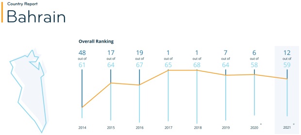 An infographic shows Bahrain’s rankings. Despite dropping from sixth spot last year to 12th in 2021, it still has the highest ranking among Gulf and Arab countries