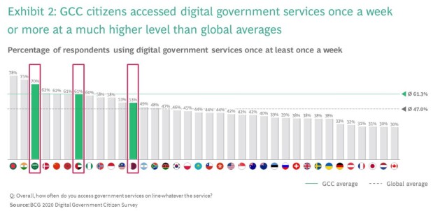 GCC countries boast an average rate of adoption of 61.3 per cent – more than 30pc above the global average. They also rank highly in terms of frequency of access to digital government services.