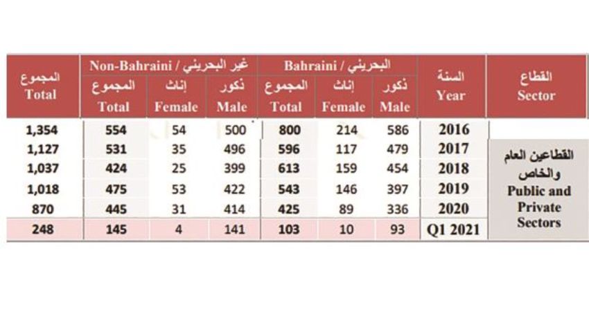 The number of workplace injuries documented among Bahrainis and expats in the public and private sectors from 2016 until the first quarter of this year