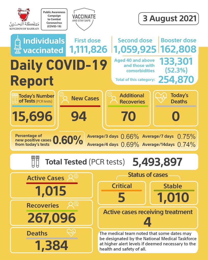 Bahrain yesterday recorded 94 new Covid-19 cases alongside 70 recoveries.