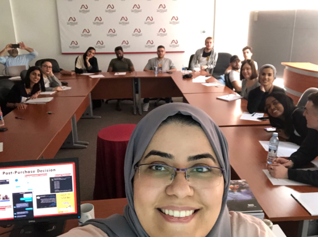 Dr Maryam Almahdi with students from France, UK, and Saudi Arabia at Ahlia University’s Study Abroad Week 2020 after her lecture on digital entrepreneurship.