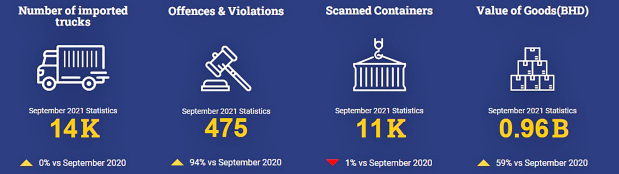 Last month’s Customs statistics compared to September last year show that BD960 million worth of products were imported by Bahrain (59 per cent increase), 475 violations and offences were noted (94pc increase), 11,000 containers were screened (1pc decrease) and 14,000 trucks imported goods.