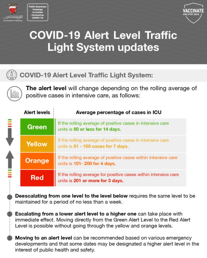 THE National Taskforce for Combating the Coronavirus (Covid-19) yesterday announced an update to Bahrain’s Covid-19 Alert Level Traffic Light System.