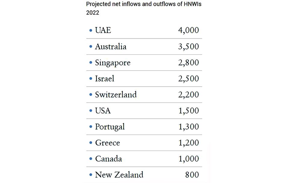 The UAE also leads the list of the top 10 countries globally in terms of net inflows and outflows of millionaires projected for 2022 (namely, the difference between the number of high-net-worth individuals who relocate to and the number who emigrate from a country).